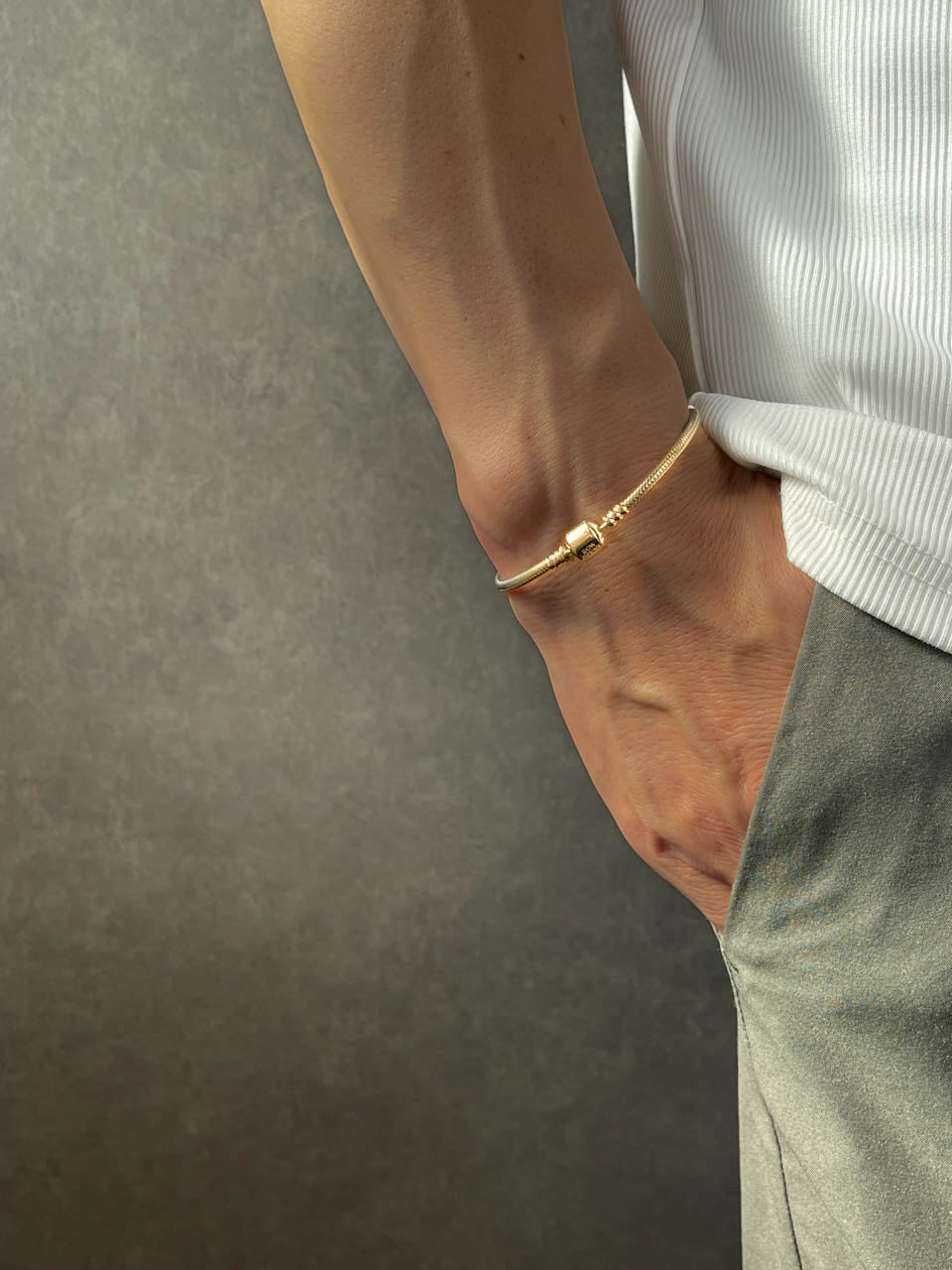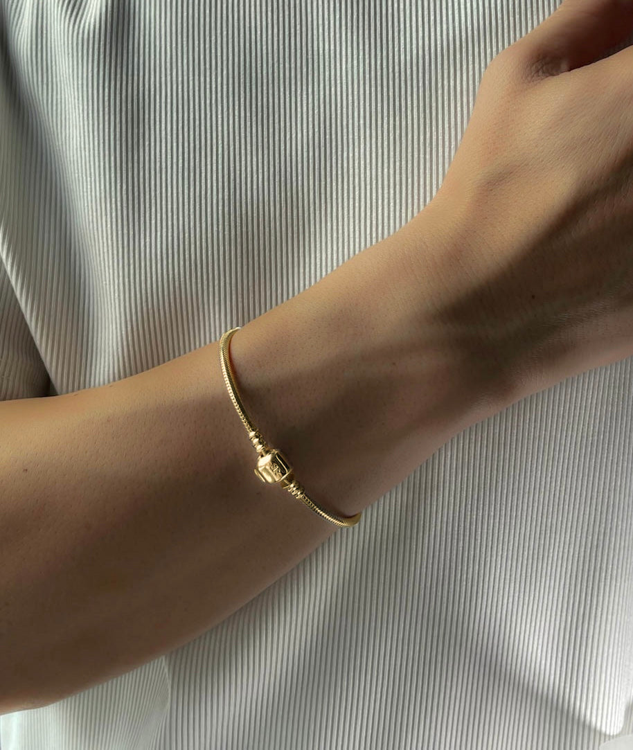 純度の高いスターリングシルバー(SV925)のスネークチェーンと、デザインをそぎ落とした主張し過ぎない金具が魅力のブレスレットです。