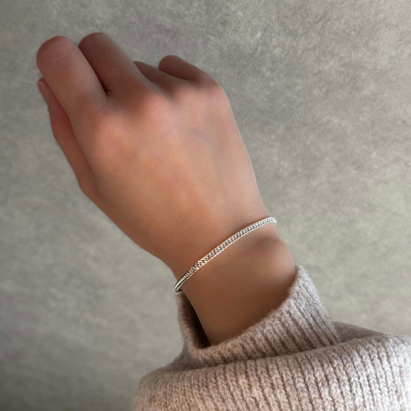 ペアでつけられ、流行り廃れのないキヘイのチェーンを探してこちらにたどり着きました。私の手首がかなり細めなのですが、とてもしっくりきています。密度があってしなやかで、キラキラ輝くので見ていて上がります!