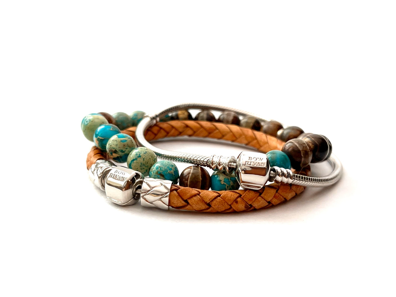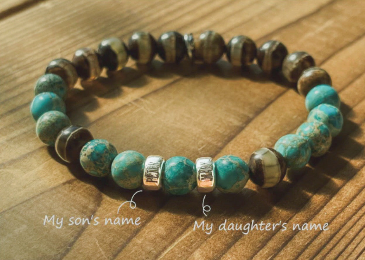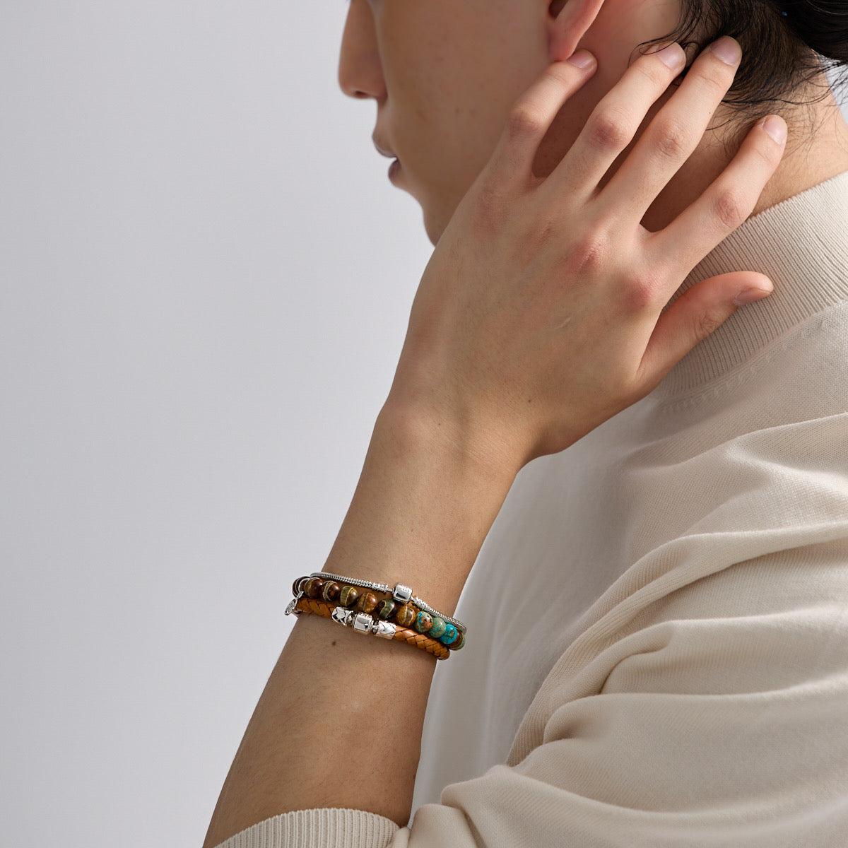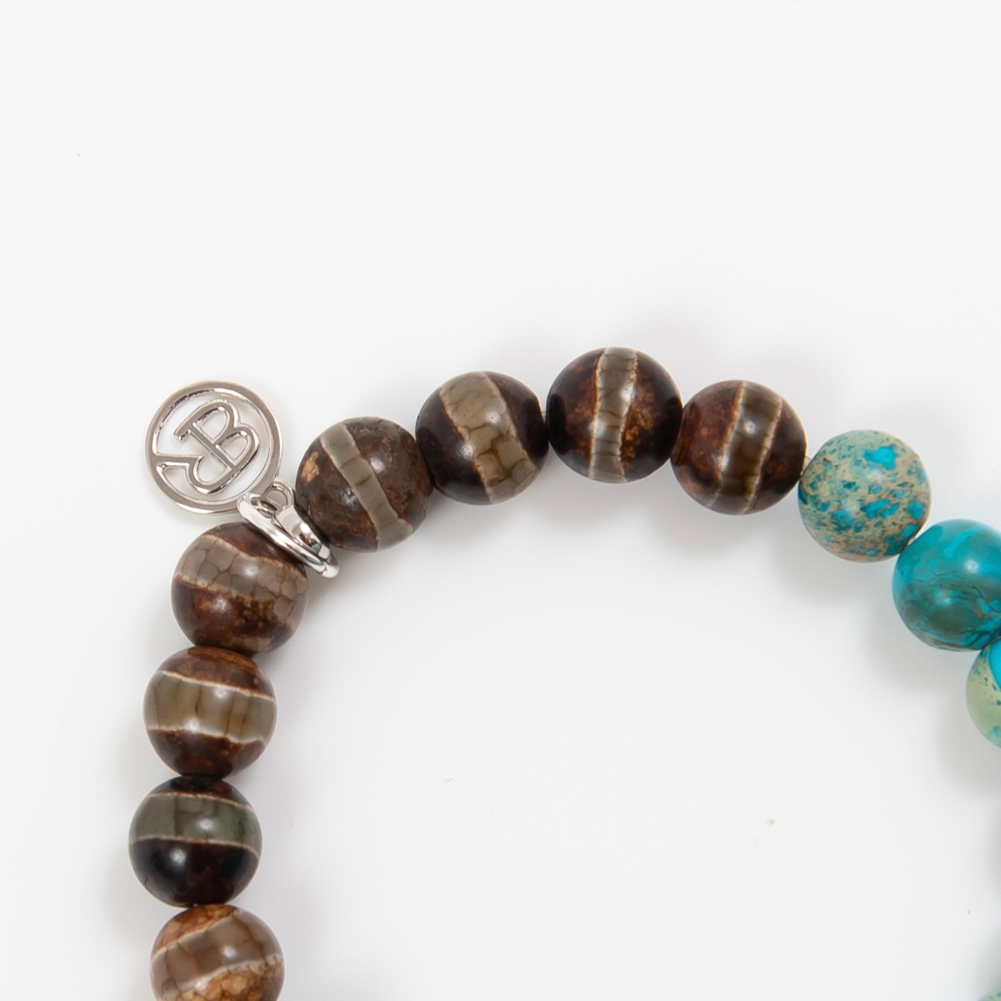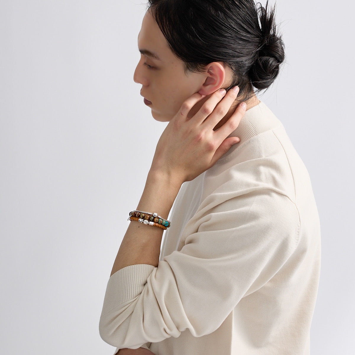 インプレッションストーンと、古くからチベットで人気の鉱石アゲート(一線天珠)を使用。ジュエリーデザイナーと職人がひとつひとつ丁寧に作った逸品です。